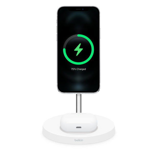 The Belkin BOOSTCHARGE PRO 2-in-1 Wireless Charger Stand with MagSafe is designed with convenience in mind with a bold modern design and optimised for speed. This ultra-convenient solution delivers the fastest possible charge up to 15W to your iPhone 12 series device in portrait or landscape. Leveraging MagSafe technology, just place your phone on the charging stand. Below, a wireless charging pad is optimised for your AirPods. The architecturally inspired design fits perfectly in any space, from office to living room.