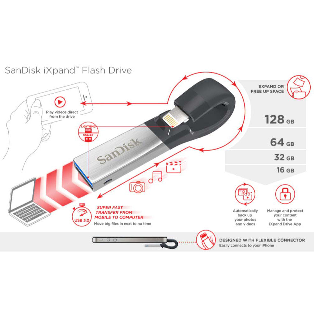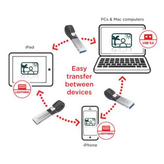 iXpand™ Flash Drive is the easiest way to transfer photos and videos between your iPhone, iPad, PCs and Mac computers. Quickly free up memory on your iPhone or iPad, and instantly expand storage by up to 64GB