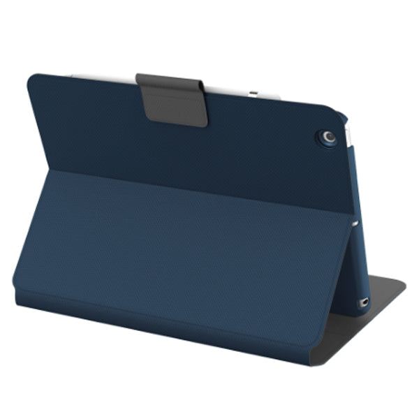 Magnetic View-lock provides maximum viewing angle stability with magnetic notches that secure the stand into place at 4 angles ranging from 40° to 70°. Sound Channels reroute sound towards the viewer, enhancing the audio experience for more enjoyable movie-viewing and game-playing. 4-foot drop protection is provided by a full wraparound polycarbonate case and extended folio corners. A secure magnetic closure seals the folio to protect the device from foreign objects, and sleep/wake magnets activate the screen when the folio is opened and closed. Built-in Apple Pencil/stylus holder