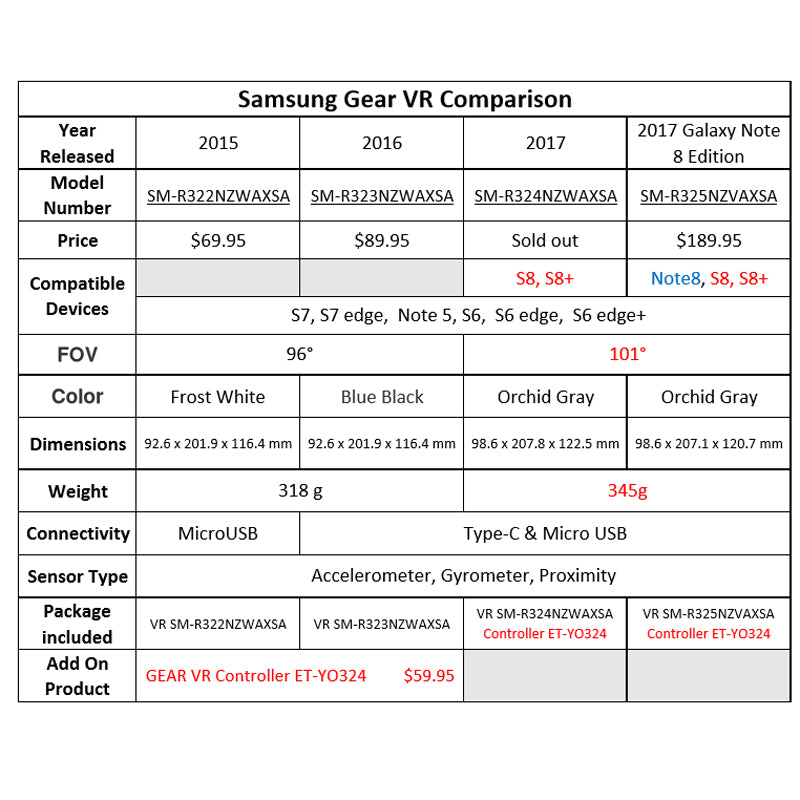 Package included | VR SM-R322 | VR SM-R323 | VR SM-R324 & ET-YO324 | VR SM-R325 & ET-YO324 |